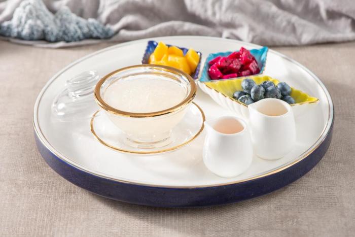 適合喜歡清爽口味的人群。先泡發好燕窩,將各種喜歡的水果,如芒果、草莓、香蕉、藍莓等洗淨切好備用。在碗中放入適量燕窩,加入切好的水果塊,再倒入一些椰汁或酸奶。椰汁的清甜或酸奶的醇厚,與燕窩和水果的清新完美融合,口感豐富,營養滿滿。