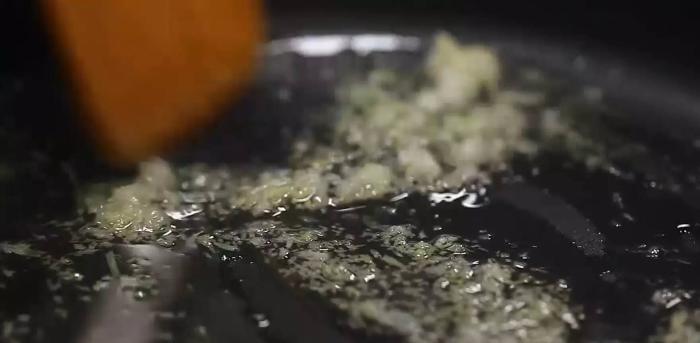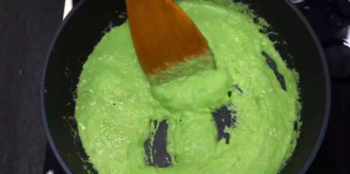 6. 看到鮮貝的水分已經出來了,就放入毛豆泥,白糖、鹽,小火炒制10分鐘。