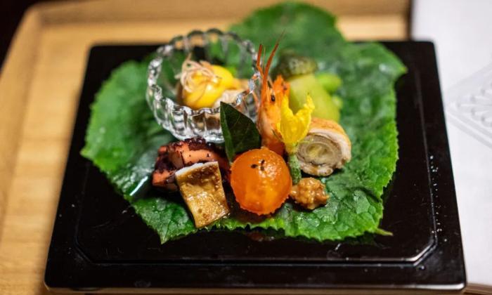 八寸一般是作為下酒菜用來表現季節性的部分,通常食材品種豐富且都是當季的食物,擺盤也比較講究。