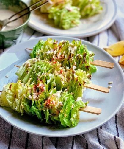 將捲心菜葉洗淨瀝乾後,切成小片,串起,下油鍋炸2分鐘左右就好啦。家裡有空氣炸鍋的也可以在捲心菜表面刷油送入空氣炸鍋180度炸8-10分鐘。