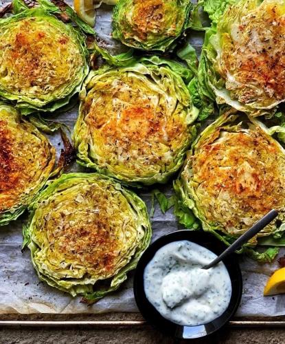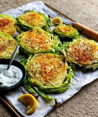將捲心菜切厚片放入烤盤中,在捲心菜上淋上橄欖油,撒大蒜粉、洋蔥粉、辣椒粉、孜然粉、胡椒粉、鹽(找不到這些撒上自己喜歡的香料也可以),送入烤箱180度烤15分鐘,看到捲心菜表面略微焦黃就能開動。